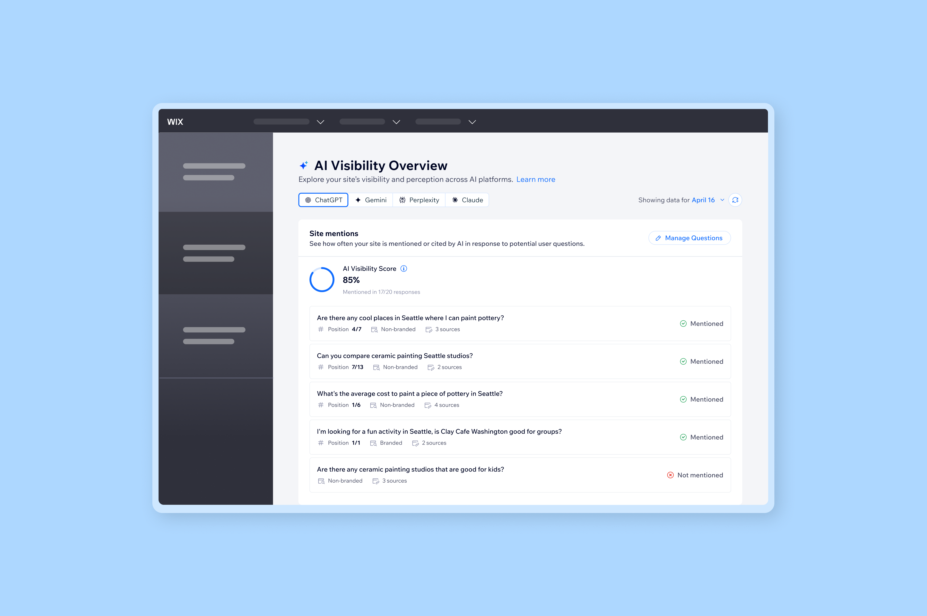 As LLMs become a key gateway for users seeking information and making decisions, visibility in AI-generated responses is quickly becoming essential for online success. GEO offers visibility into how a brand is perceived and surfaced by leading AI models, transforming how businesses approach their presence in the age of generative AI. Fully integrated into Wix’s SEO suite and accessible through the Analytics dashboard, GEO reflects Wix’s response to the evolving nature of search, providing users with a wide view of how their brand and content are being surfaced and engaged with across AI-powered platforms.